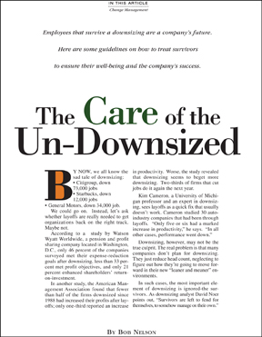 Employees that survive a downsizing are a company's future. Here are some guidelines on how to treat survivors to ensure their well being and the company's success.